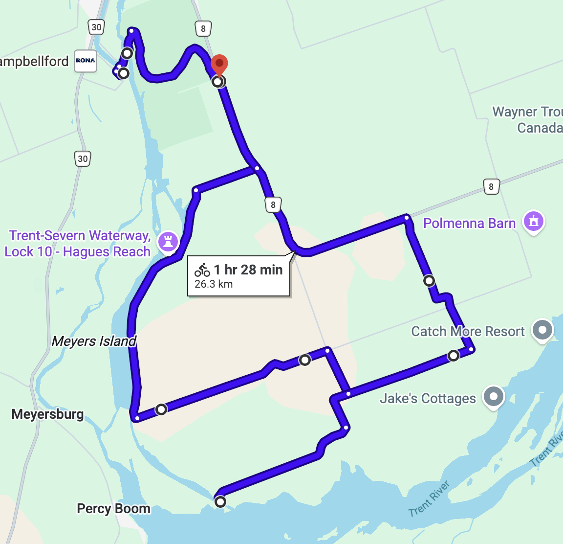 Start at the Campbellford Lock 11. Head over the suspension bridge through Ferris Park to Haig's Reach and then on to Empire Cheese. Approx 30km