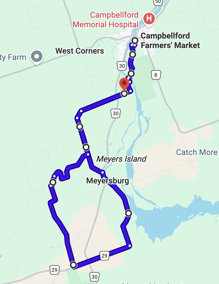 Campbellford Farmer's Market looping south to Warkworth and back up to Percy Boom along beautiful back roads. Approx 35k